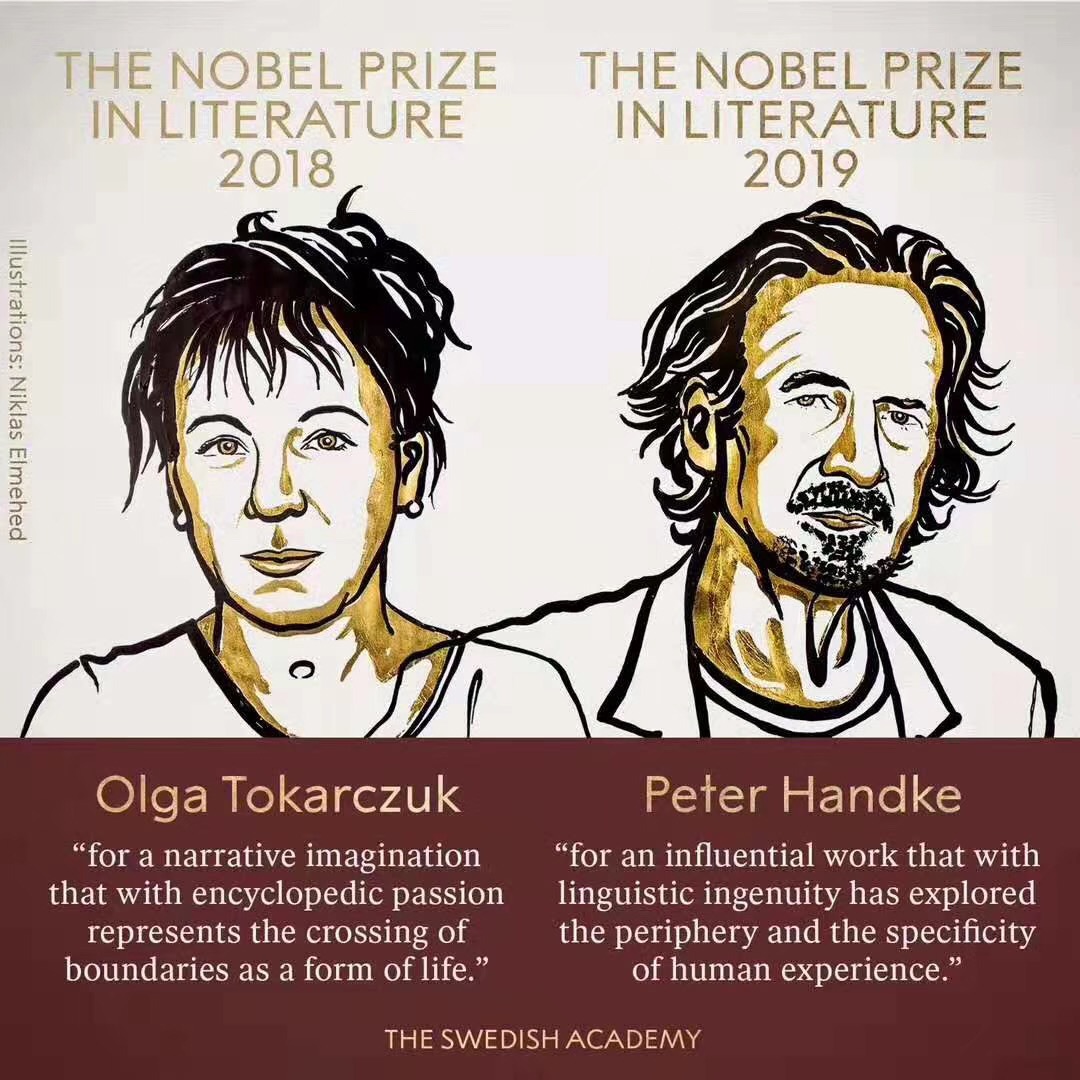 刚刚,瑞典文学院将2018和2019年度的诺贝尔文学奖分别颁发给了波兰作家奥尔加・托卡尔丘克(Olga Tokarczuk)和奥地利作家彼得・汉德克(Peter Handke)。