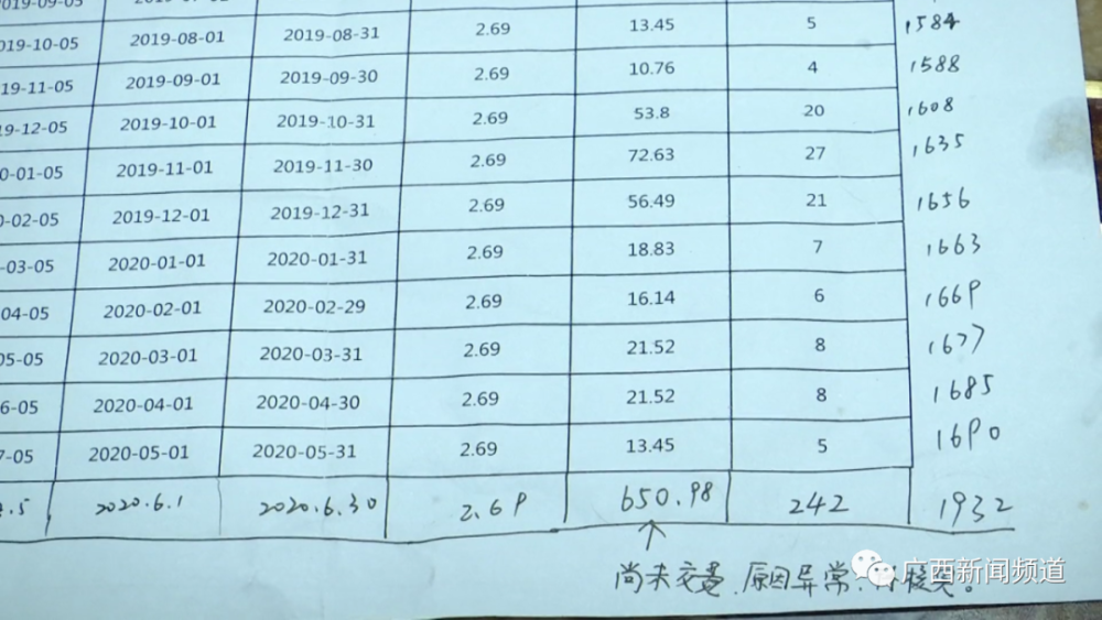 为了了解具体情况,韦女士从物业那里打印了一份水费清单,上面显示,从2018年到2020年5月份,这套房子之前水费最高的一个月也就是70多块钱。然而,2020年6月的水费数据却明显增加,用水量达到了242立方,水费总共是650.98元,也就是说,韦女士家里相当于每天用掉了8吨多的水。