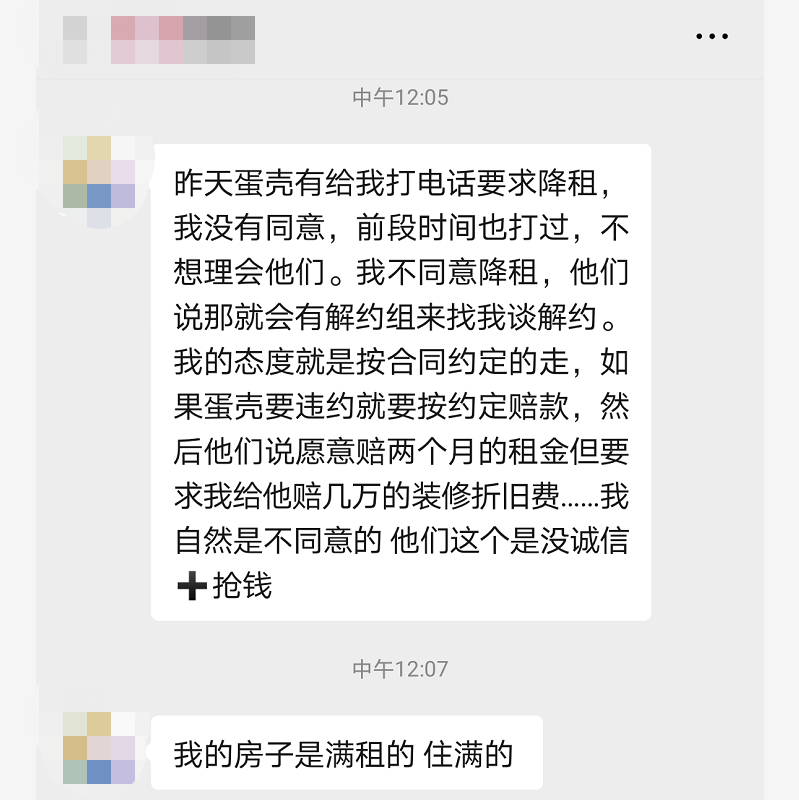 无独有偶,深圳另一位房东向中国证券报记者反映,从今年3月份开始,自己频繁接到蛋壳公寓工作人员要求降租金的电话,在自己明确表示不会降租后,对方表示将与自己解约,届时自己需要向蛋壳方面赔偿相关装修的损失。