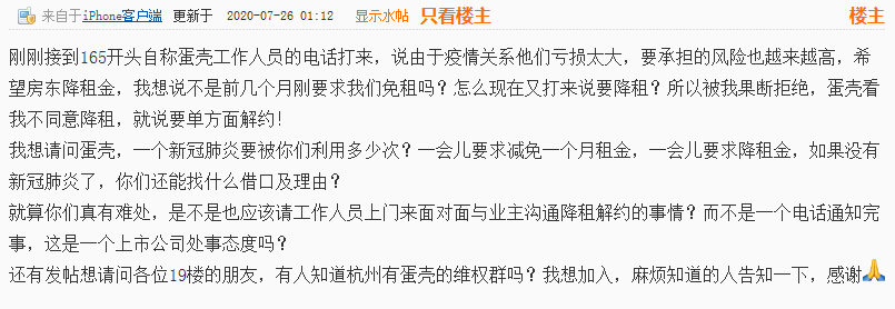 “之前2月份跟房东申请免租,是在跟房东寻求一个‘爱心支持’,而这次降租则是根据市场价格进行协商的行为。这是两码事。”8月10日,蛋壳公寓回应中国证券报记者称,确实有一部分房东收到了协商降租金的电话。主要原因是一部分房东的租金属于所在片区价位偏高的状态。另一个原因是疫情之后整个租房市场整体形势发生变化,不管是租客的承租能力还是付租意愿都有比较大的波动。基于以上两点原因,公司在跟这些房东协商降租的情况。