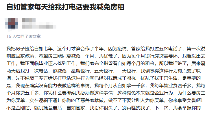来自北京、深圳多地房东反映,今年以来已经陆续多次收到来自自如管家的减租要求。其中有些房东是在3月份收到的,有些则是6、7月份收到的。有房东表示,这种频繁要求减租的行为已经对自己正常生活造成了骚扰。