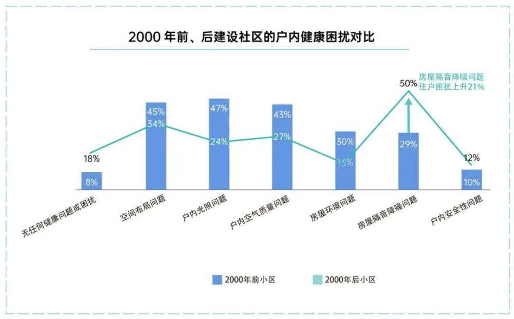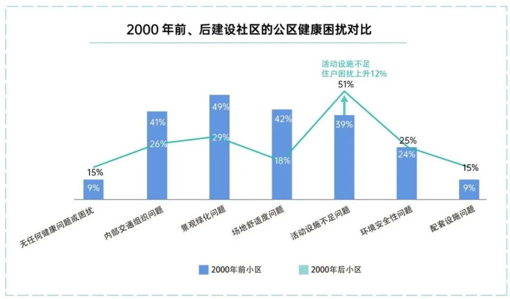 调研报告显示,对比2000年前后的社区状况,大部分的健康困扰都得到了大幅改善(上图)。同时,受到房屋隔音降噪问题困扰的住户却大幅上升了21%,由于活动设施不足带来困扰的住户也上升了12%。