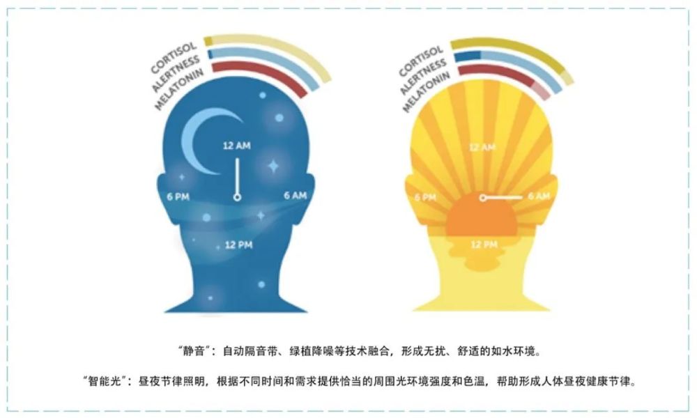 针对光照,通过室内照明灯具整合光敏传感器、时间控制器,自动模拟自然光环境,营造适于入睡的氛围;