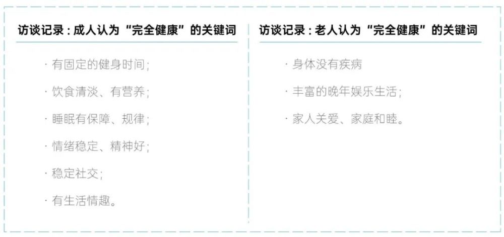 根据报告,城市居民中在观念上,对于健康的评价标准在不断提高。健康不仅仅是“身体好、不生病”,还包括健康的心理精神状态、社交关系、外貌形体、行为习惯等等。老年人也认为“完全健康”还要有丰富的娱乐生活,好的家庭氛围。