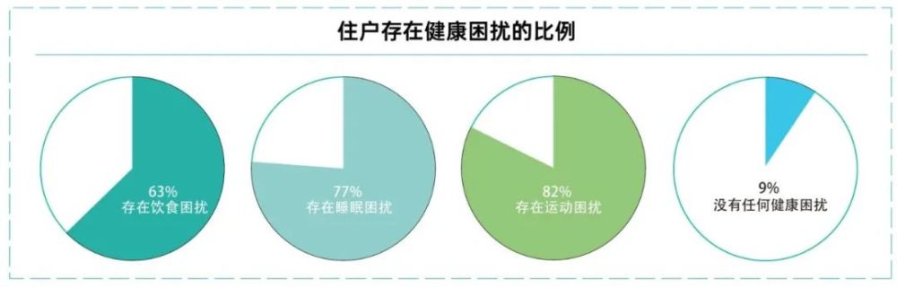 空间设计一直是买房客户关注的重点,在此次调研中,空间布局问题也位居居民户内健康困扰的第二名,不满意的住户比例高达 38%。关注空间优化,将健康融入生活场景将成为未来健康住宅的新趋势。