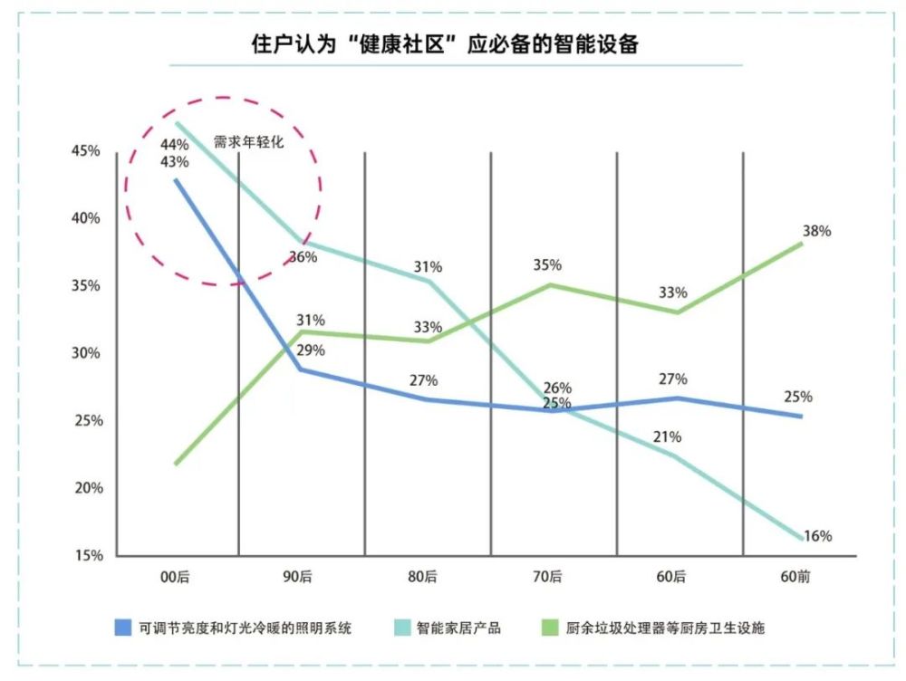 相反,客户对一些实用性设备的需求却在快速爆炸。例如厨余垃圾处理器、洗碗机等一体式的设备,减少劳动量、便于垃圾分类,随着客户年龄的增加,需求反而呈上升趋势。没有开发商在健康设计上,没有及时捕捉到客户的新需求。