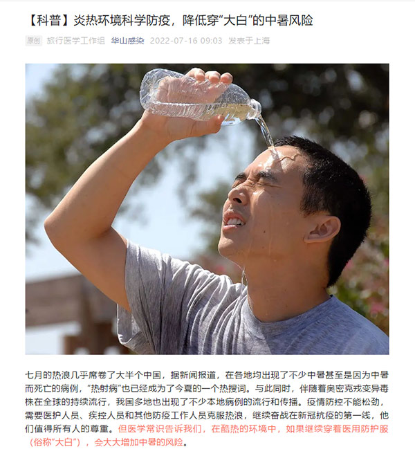 “炎热环境科学防疫,降低穿‘大白’的中暑风险。”7月16日,复旦大学附属华山医院张文宏教授团队在“华山感染”公众号上发文提示,在酷热的环境中,如果继续穿着医用防护服(俗称“大白”),会大大增加中暑的风险。同时,一件被汗水浸透的“大白”,其防护作用也已经大打折扣。