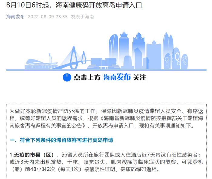 8月10日6时起,海南健康码开放离岛申请入口 健康
