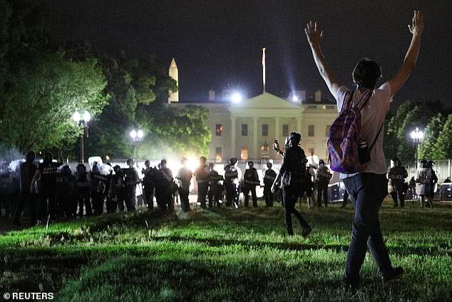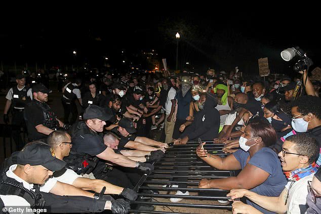在对峙过程中,数百位抗议者高呼着“没有正义,没有和平”以及“说出他的名字:乔治・弗洛伊德”等类似的口号,据悉特工使用了胡椒喷雾,强行让示威人群退后。一些示威者的眼睛又红又肿。