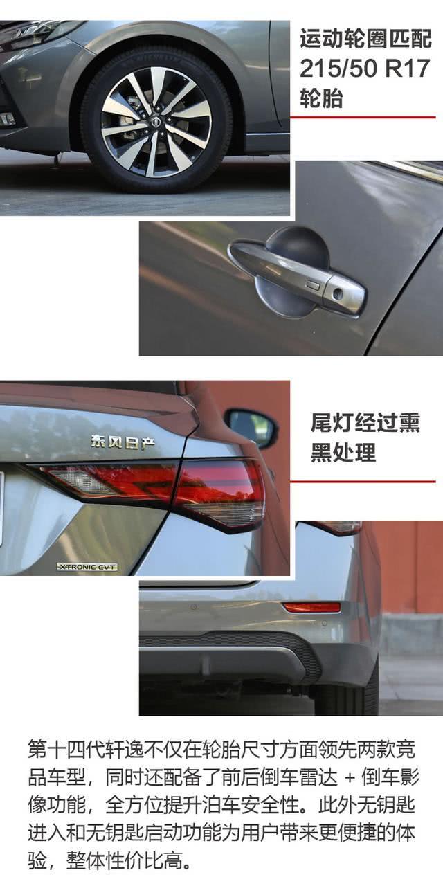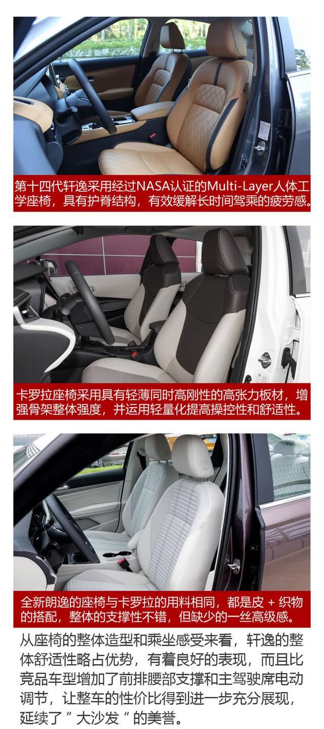 通过对三车的外观和内饰进行详细比较可以发现,第十四代轩逸在气质方面有着突出的表现,造型设计已体现出了高端化和精致感,时尚运动已不再是唯一的设计语言,而车内的质感和人性化程度也都具有明显的优势,在保留高舒适性的优良传统的同时,注入了豪华质感的细节元素,很有高级感。而第十二代卡罗拉在智能化体验方面有一定的优势,给人一种科技感十足的印象。至于全新朗逸的设计与前两者有着不同的理念,整体形象更成熟稳重,在配置方面也比较常规,亮点并不突出。总体而言,第十四代轩逸在颜值方面相比两款竞品有着更全面、更年轻、更动感的表现,高端审美宛如B级车一般,可以说在气质这一块,第14代轩逸还真是无可挑剔的。