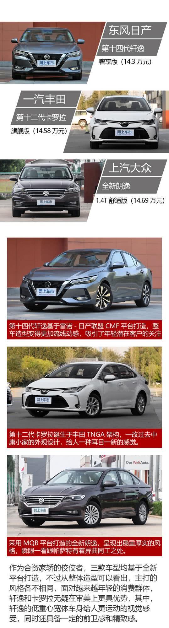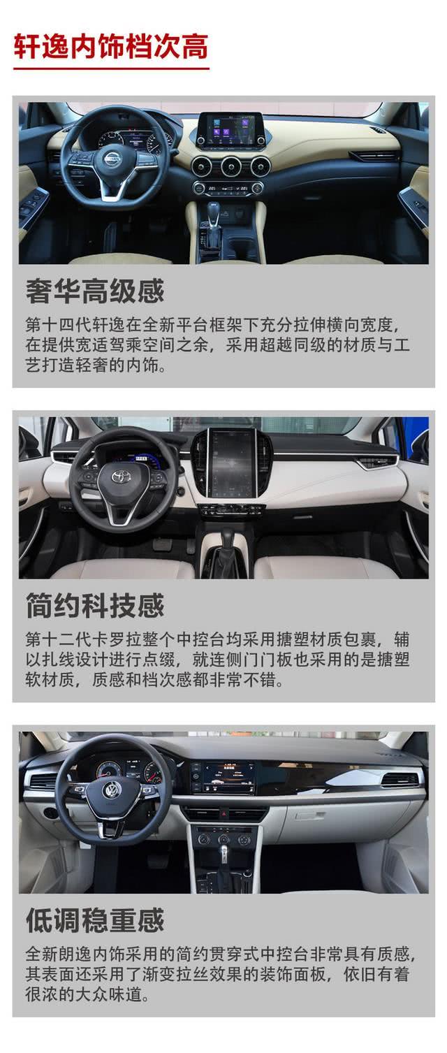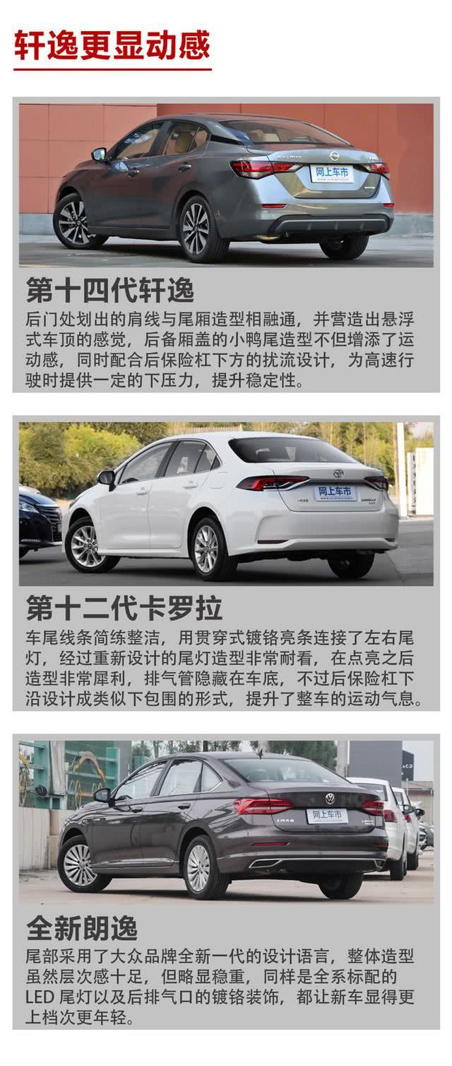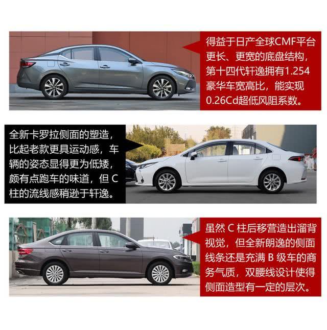 通过对三车的外观和内饰进行详细比较可以发现,第十四代轩逸在气质方面有着突出的表现,造型设计已体现出了高端化和精致感,时尚运动已不再是唯一的设计语言,而车内的质感和人性化程度也都具有明显的优势,在保留高舒适性的优良传统的同时,注入了豪华质感的细节元素,很有高级感。而第十二代卡罗拉在智能化体验方面有一定的优势,给人一种科技感十足的印象。至于全新朗逸的设计与前两者有着不同的理念,整体形象更成熟稳重,在配置方面也比较常规,亮点并不突出。总体而言,第十四代轩逸在颜值方面相比两款竞品有着更全面、更年轻、更动感的表现,高端审美宛如B级车一般,可以说在气质这一块,第14代轩逸还真是无可挑剔的。