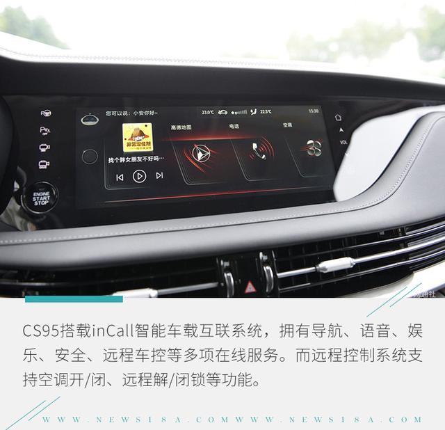 除了上面介绍的那些亮点以外,全新CS95还搭载L2级别自动驾驶水准的iACC集成式自适应巡航系统,拥有单车道自动辅助驾驶、交通拥堵辅助、自动减速过弯、隧道/匝道提前减速等,而LCDA智能后向辅助系统包含倒车横向预警、换道辅助、盲区检测、后追尾预警、开门预警等。此外,新车还搭载360°全景影像,配备4个100万像素高清摄像头和3D投射。