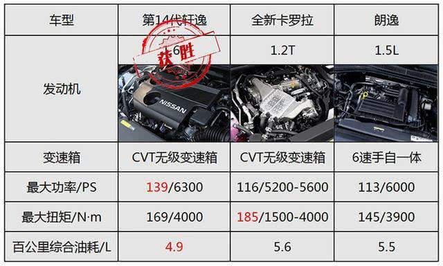 动力上,东风日产第14代轩逸比一汽丰田全新卡罗拉多53马力,比上汽大众朗逸多56马力,第14代轩逸以绝对优势领先;传动系统,第14代轩逸与卡罗拉均为CVT无级变速箱,在平顺性与燃油经济性方面表现突出,而朗逸匹配6速手自一体变速箱,带有手动与运动模式,具有一定驾驶乐趣,两种变速箱各具特色;油耗方面,第14代轩逸百公里综合油耗4.9L,卡罗拉百公里综合油耗5.6L,朗逸百公里综合油耗为5.5L,第14代轩逸燃油经济性更好。