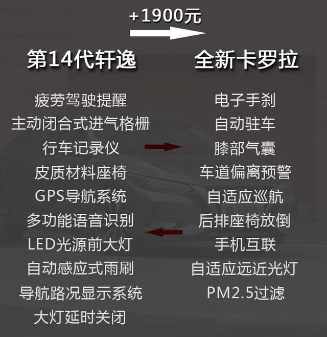 其中,相比全新卡罗拉,第14代轩逸多了疲劳驾驶提醒、主动闭合式进气格栅、行车记录仪、皮质座椅、GPS导航系统、多功能语音识别、LED光源大灯、自动感应式雨刷等配置;而全新卡罗拉则多出电子手刹、自动驻车、膝部气囊、车道偏离预警、自适应巡航、后排座椅放倒、手机互联、自适应远近光灯、PM2.5过滤等,结合全新卡罗拉贵1900元,第14代轩逸性价比稍占优势。