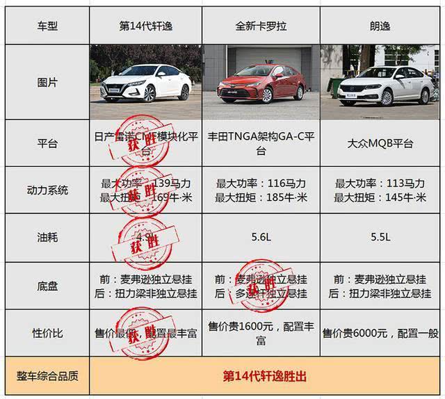 结论,通过以上对比,我们不难看出第14代轩逸采用的日产雷诺CMF平台相比其他两款车型更具优势;其搭载的HR16 1.6L自然吸气发动机也有着绝对领先优势,让其实现强劲动力与燃油经济性双重标准;底盘悬挂方面,则是全新卡罗拉的表现更好,以多连杆后独立悬挂的形式领先于其他两款车的扭力梁非独立悬挂;性价比方面,在三款车主推的同价位区间内,第14代轩逸售价最低,配置反而最丰富。因此,三款车型在整体品质上无疑是第14代轩逸胜出,表现更优。