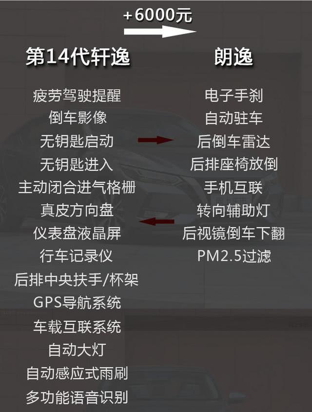 相比朗逸,第14代轩逸在配置上多出疲劳驾驶提醒、倒车影像、无钥匙启动、无钥匙进入功能、主动闭合进气格栅、真皮方向盘、仪表盘液晶屏、行车记录仪、后排中央扶手、后排乘客杯架、GPS导航系统、车载互联系统、多功能语音识别、自动大灯、自动感应式雨刷等;而朗逸则多出电子手刹、自动驻车、后倒车雷达、后排座椅放倒、手机互联、转向辅助灯、后视镜倒车下翻、PM2.5过滤等,结合朗逸售价贵出6000元,无疑第14代轩逸性价比更高。