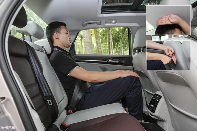 保持前排座椅位置不变,同一体验者坐入后排,头部空间剩余四指,腿部空间超过两拳。