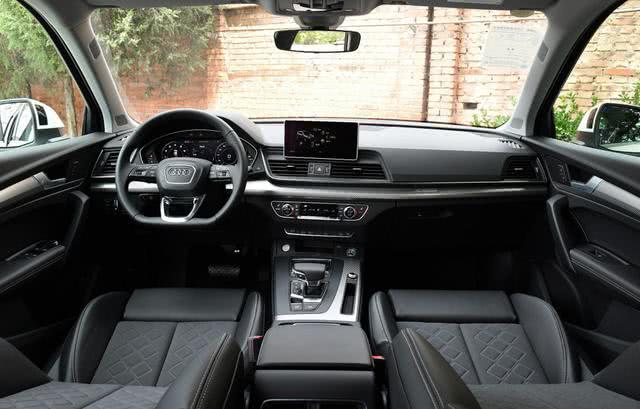 奥迪Q5L的内饰的做工符合这一级别的要求,在软性材料的使用上也并不吝啬,不过在营造豪华感这一方面相比竞品还略有欠缺,仪表盘和方向盘都值得点赞,12.3英寸的全液晶仪表盘显示效果很清晰,显示的内容也挺丰富的。方向盘手感很不错,虽然不是运动版使用的平底方向盘,但是造型依然很有特色。MMI导航Plus系统以及平视显示系统也使全新Q5的内饰更具科技感。
