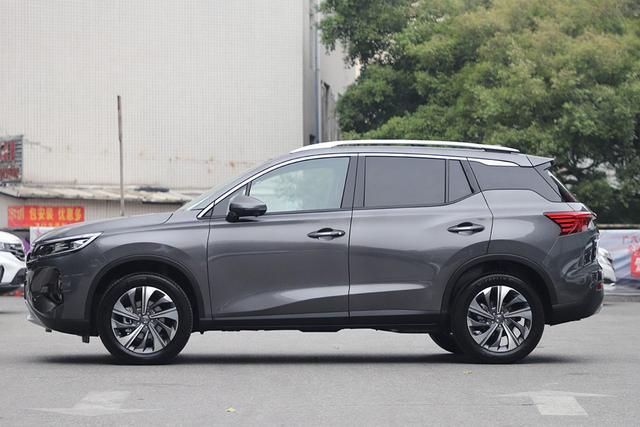 从车侧车来看,其造型较为硬朗魁梧,前后上挑的翼子板线条以及悬浮式车顶等流行元素的加入带来了更强的时尚感。车身尺寸方面,其长宽高分别为4650/1860/1700mm,轴距为2712mm,处于紧凑型SUV的主流水平。车尾部分,贯穿式尾灯、后扰流板折线设计以及大面积的黑色防擦区域和银色下护板,都让整车看起来颇为运动。