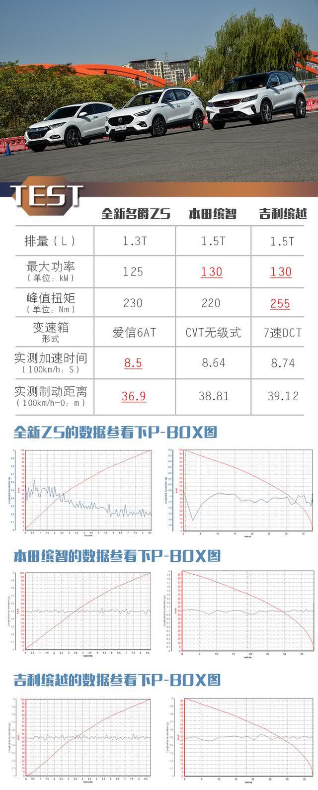 成绩上互有攻守,但在实际的呈现特性上各有不同。名爵ZS硬件基础最大的亮点就是在于它的爱信6AT变速箱,传统AT变速箱最大的优点在于它的液力变矩器在紧急加速时,它的动力预存功能和输出的舒畅性是CVT和双离合变速箱无法比拟的,这也是名爵ZS依靠更弱的动力参数取得更强加速的秘密所在。而在刹车方面,除了选用米其林Primacy 3st这样的高等级轮胎之外,名爵ZS在刹车踏板的调教上,它的制动力分配的更加绵密,全域的制动力输出线性,也造就了它更好的制动成绩。