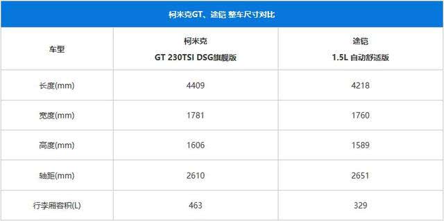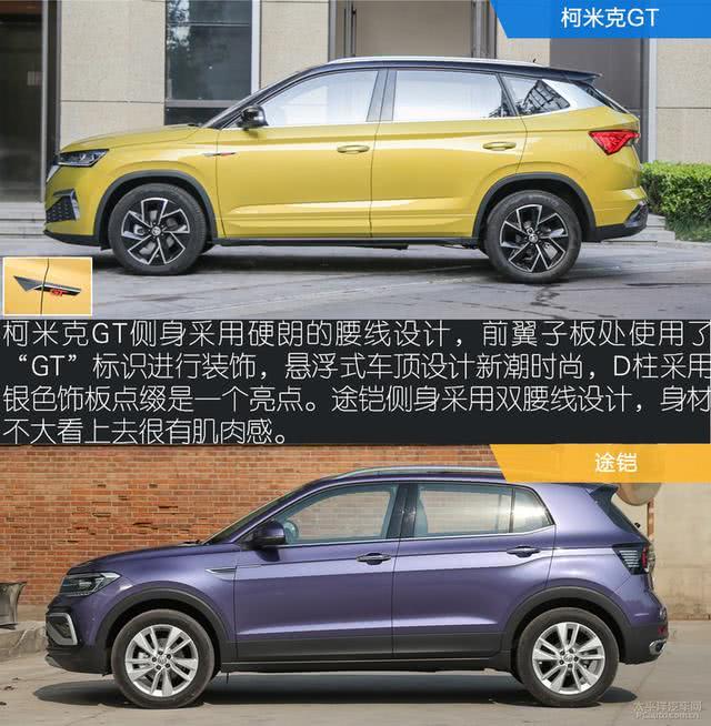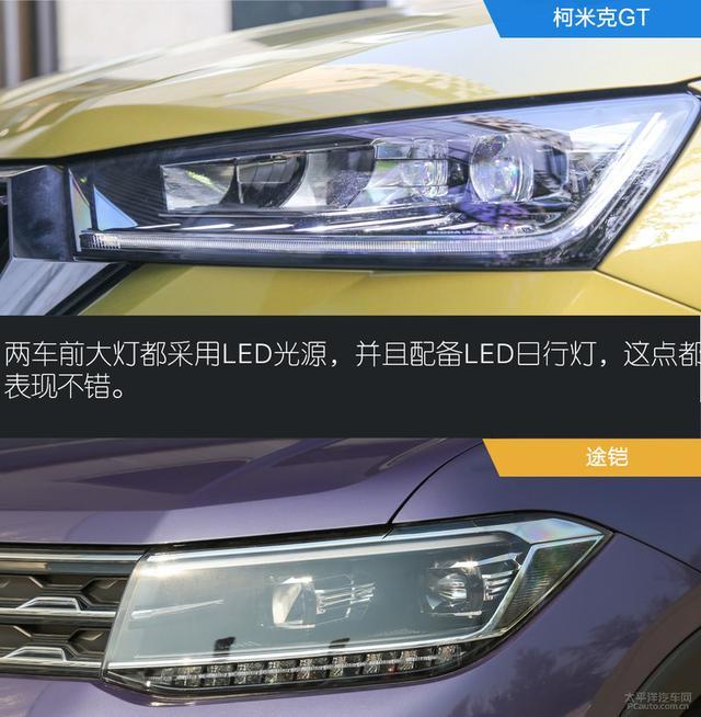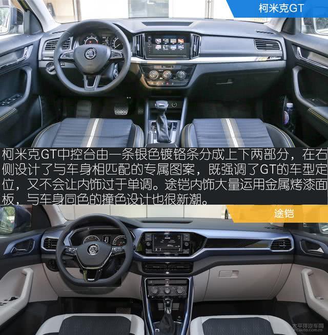 小结:柯米克GT在设计上运用了诸多潮流元素,像悬浮式车顶、撞色搭配、GT标识等,符合年轻消费者的审美。途铠相比其他大众车型在设计上也更有个性。配置方面,两车都配备LED大灯和17英寸铝合金轮毂,柯米克GT多出一项无钥匙进入功能。