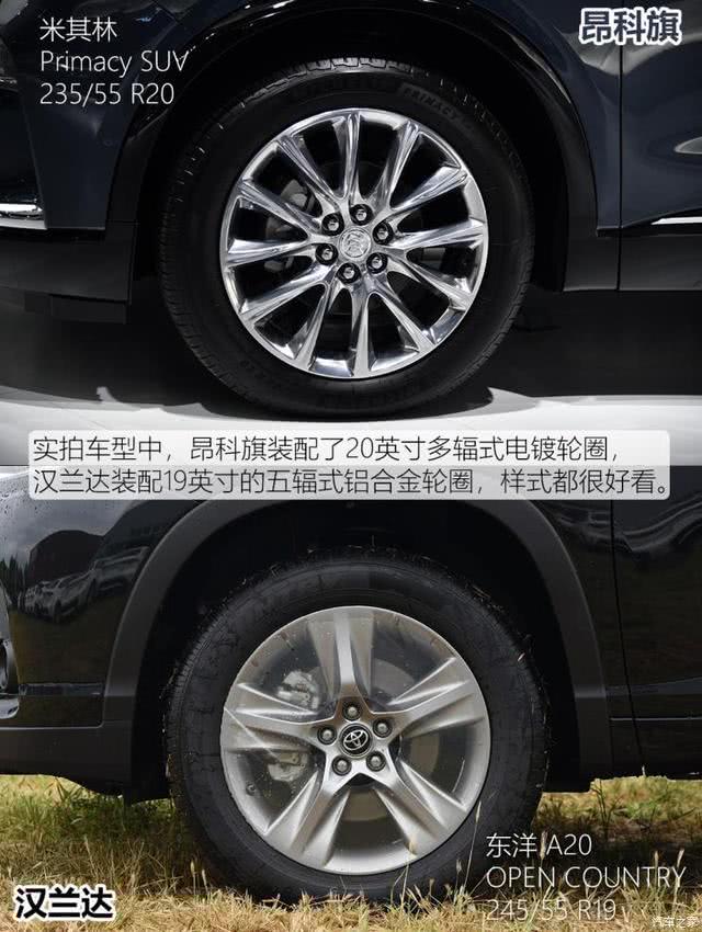 昂科旗大部分车型都装配20英寸轮圈,胎宽235mm,低配车型为18英寸轮圈,胎宽相同,Avenir车型为21英寸轮圈,胎宽265mm。汉兰达提供18和19英寸两种选择,胎宽都是245mm。昂科旗采用了多辐式镀铬轮圈,视觉效果更加高级好看,很有美国都市精英的风格,汉兰达装配5辐式轮圈,更具有力量感,和印象中西部牛仔的样子更为贴合。
