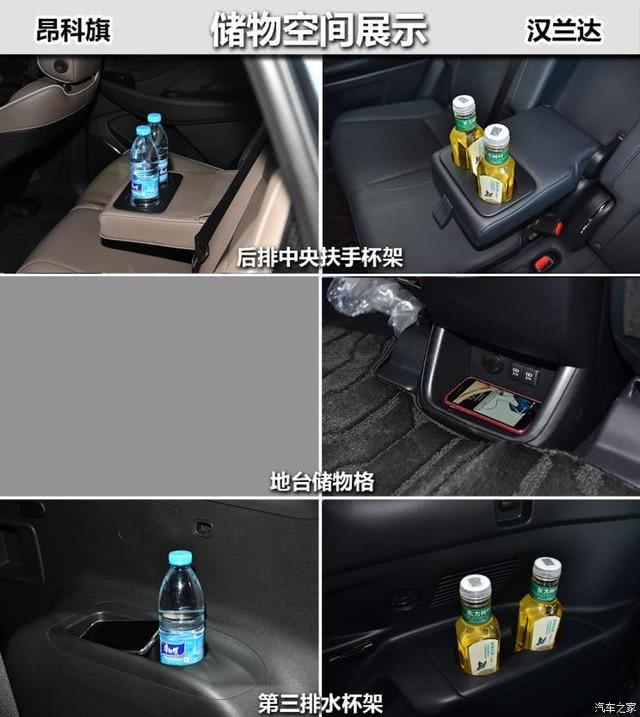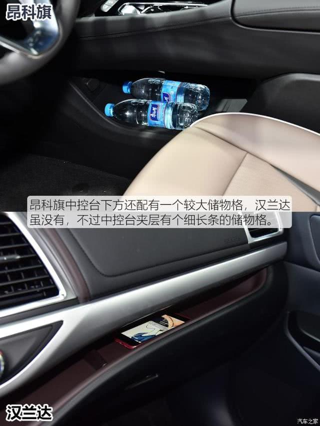 常规的储物空间两者表现都很不错,前后排杯架均配有限位器。汉兰达(参数|询价)的中央扶手箱储物格巨大,目测可以至少放下10瓶550ml的水瓶。而昂科旗储物空间虽然丰富,但容积比较常规,不如汉兰达实用。