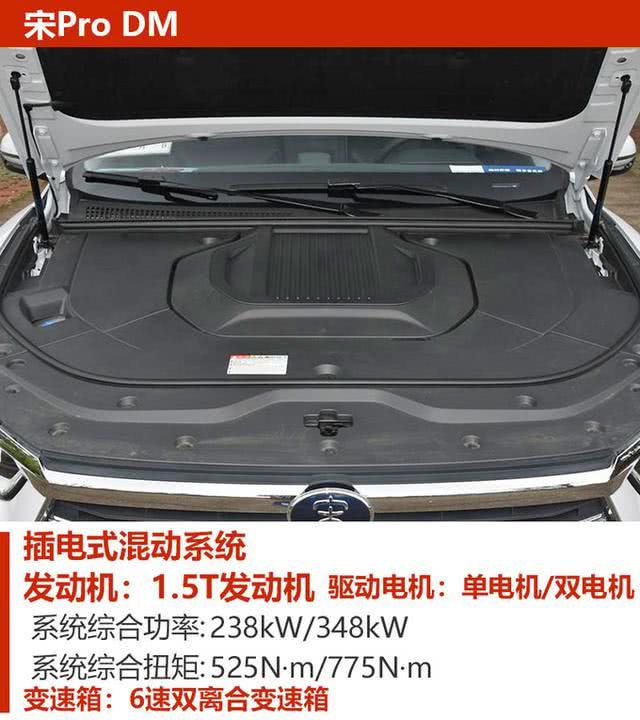 在动力总成上,宋Pro DM提供四驱性能版和四驱高能版两种动力版本,其中四驱性能版采用双擎四驱动力架构,这套动力架构由1.5T发动机与后桥单电机组成,系统综合功率为238kW,系统综合扭矩为525N·m;而四驱高能版采用三擎四驱动力架构,这套动力架构由1.5T发动机与前后双电机组成,系统综合功率为348kW,系统综合扭矩为775N·m,匹配的均为6速双离合变速箱。