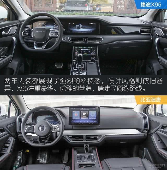 两款车型的内饰无疑都处在10-15万价位车型中最靠前的水准,捷途X95在档次、豪华感上占优,比亚迪唐更有运动味道,简约之中丝毫不缺时尚与科技。