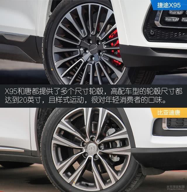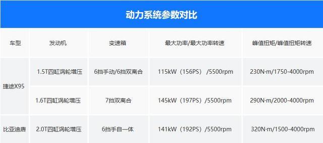 动力部分,捷途X95提供1.5T和1.6T两款发动机,分别匹配6MT/6DCT和7DCT变速箱,唐全系均搭载2.0T发动机,匹配6AT变速箱。