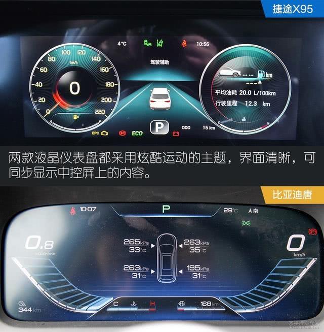 多媒体配置方面,捷途X95 1.6T探索Pro版配备了12.3英寸的全液晶仪表盘,唐2.0T智联尊贵型的液晶仪表尺寸为5英寸。双方都配有大尺寸中控触摸屏,内置功能均丰富先进。