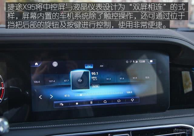 捷途对于X95这款全新车型的内饰也下足了功夫和成本,足够让初次接触它的人眼前一亮,12.3英寸全液晶仪表盘+12.3英寸中控屏幕+9.7英寸空调触控屏的三大屏布局极具科技范,并通过中控台大面积的钢琴黑色中控面板与座椅/门板上的菱形纹路营造出优雅的氛围。